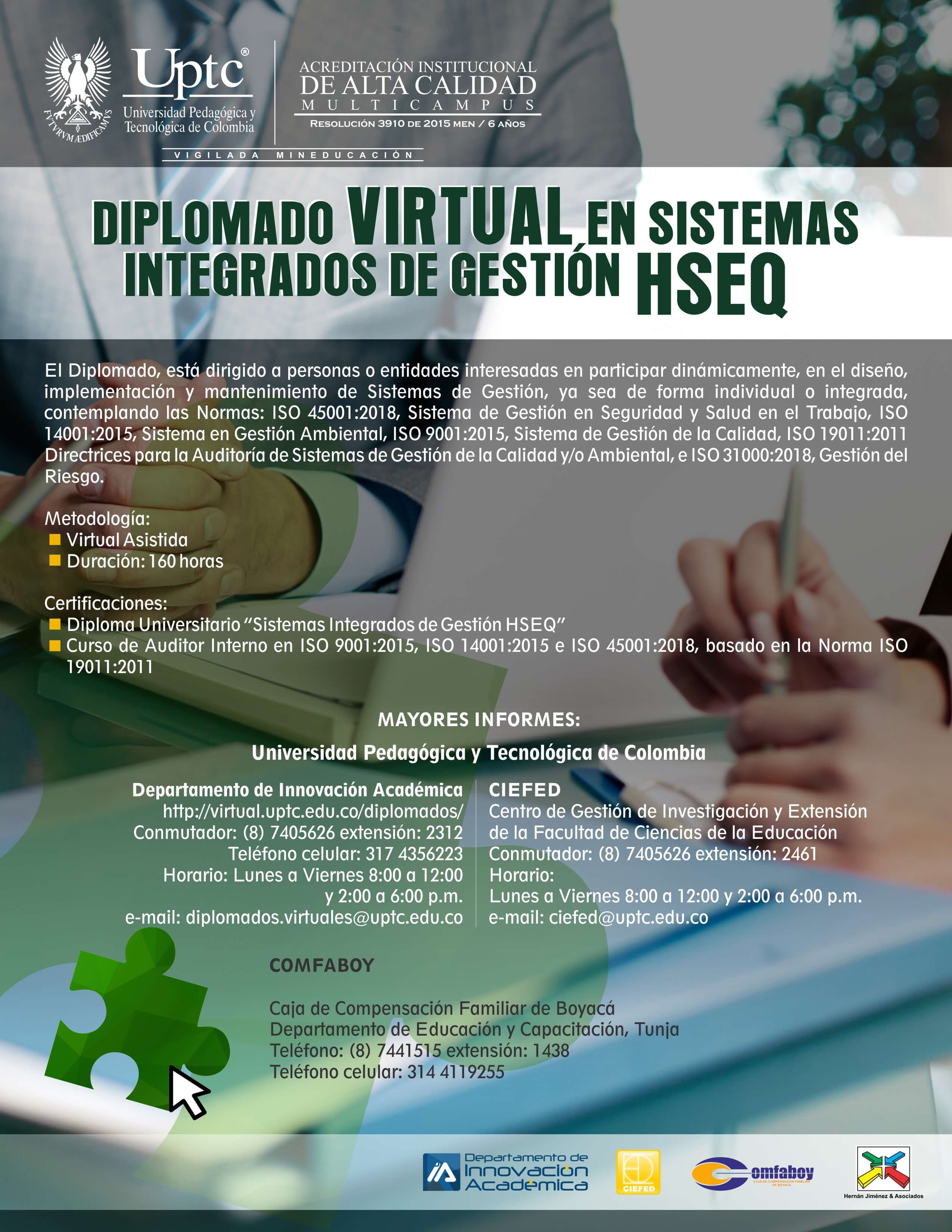 El Diplomado, está dirigido a personas o entidades interesadas en participar dinámicamente, en el diseño, implementación y mantenimiento de Sistemas de Gestión, ya sea de forma individual o integrada, contemplando las Normas: ISO45001:2018, Sistema de Gestión en Seguridad y Salud en el trabajo, ISO 14001:2015, Sistema en Gestión Ambiental, ISO 9001:2015, Sistema de Gestión de la Calidad, ISO 19011:2018. Directrices para la Auditoría de Sistemas de Gestión de la Calidad y/o Ambiental, e ISO 31000:2018 Gestión del Riesgo.